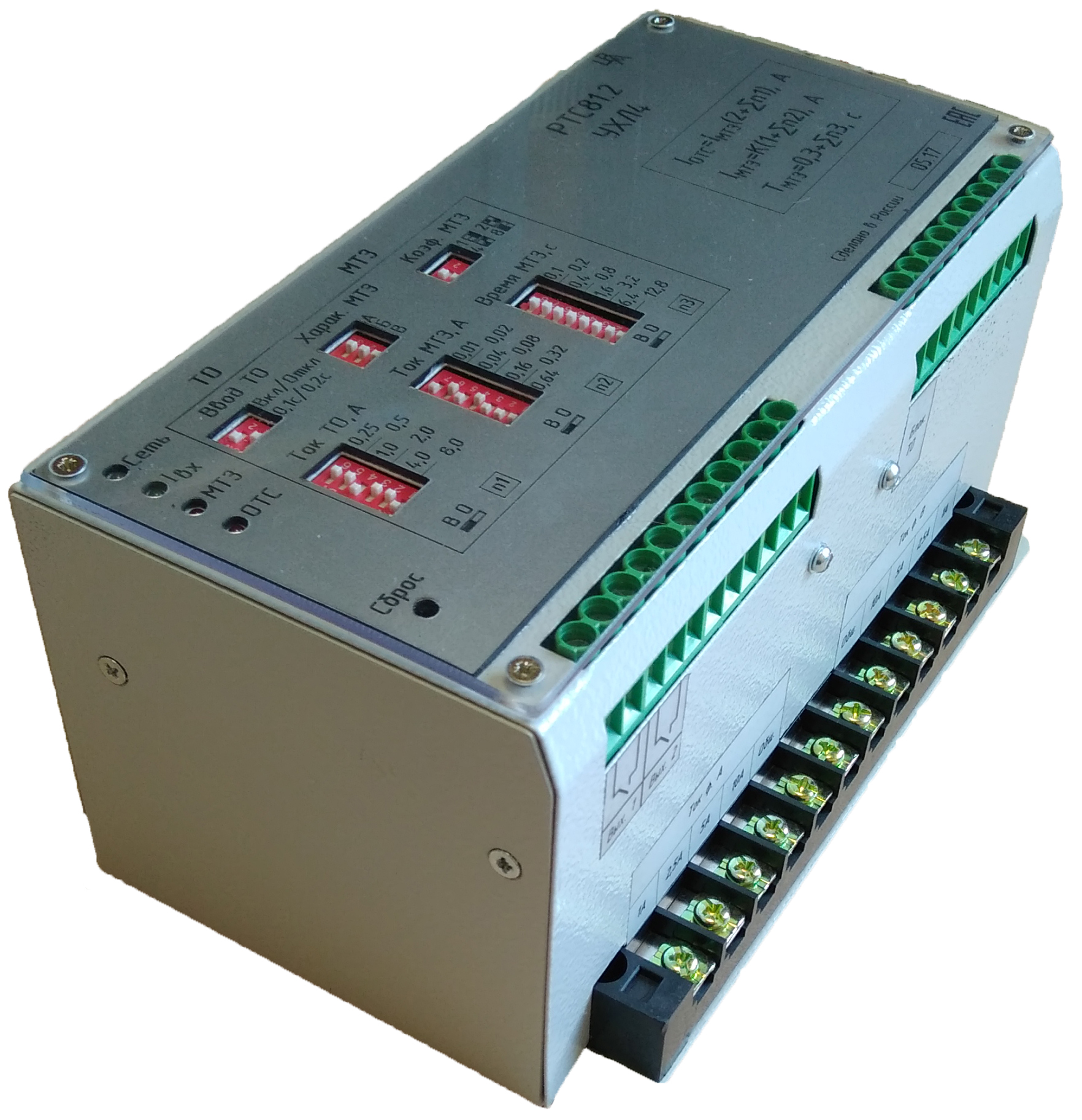 - токовую отсечку (ТО) в однофазном (или двухфазном) исполнении с временной задержкой 0,1 с или 0,2 с, которая задается с передней панели;